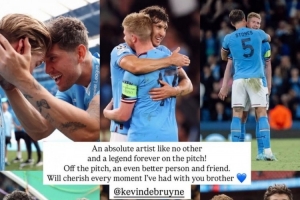 曼城后卫斯通斯更新社媒,晒出了自己与德布劳内一同举起冠军奖杯、在赛场上相拥、相互鼓励的点滴,并配文写道:“一位难出其右的球场艺术家,同时也是永远闪耀在绿茵场上的传奇!场下你是如此富有人格魅力的伙伴。荣幸和你度过的那些美好瞬间,将永存我心,好兄弟!@德布劳内”